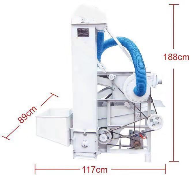 該篩選機可選用220V-2.2kw或380V-1.5kw電機做動力源,集風(fēng)選和篩分為一體,能干凈徹底地清除糧食或油料種子里面的各種雜質(zhì)和塵土。本機為種子凈選機,篩選種子,去除種子中的雜物和沙塵使用,帶有抽風(fēng)機,兩層鐵框篩網(wǎng)好用壽命長。多功能帶抽風(fēng)機振動篩設(shè)計合理,結(jié)構(gòu)緊湊,生產(chǎn)效率高,一機多用,可套風(fēng)塵袋室內(nèi)、室外均可用,經(jīng)濟實惠,是廣大農(nóng)戶的產(chǎn)品,糧食篩選機結(jié)構(gòu):該機由料斗、機架、傳動機構(gòu)、風(fēng)機、風(fēng)道等五部分組成,機架地腳裝有四個輪子,方便移動;篩網(wǎng)與機架采用分體式結(jié)構(gòu),便于更換各種不同目數(shù)的網(wǎng)篩