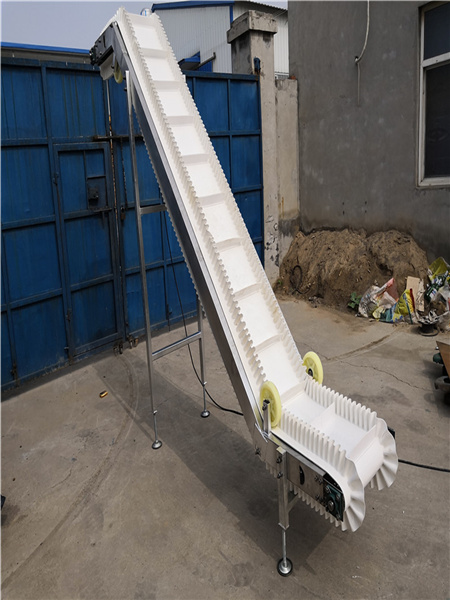 裙邊皮帶輸送機常用于輸送小型、顆?;蚍勰町a(chǎn)品,裙邊為熱熔在輸送帶兩側(cè)波浪起伏狀的帶狀皮帶護邊,為防止微小產(chǎn)品從皮帶縫隙掉落到皮帶輸送機內(nèi)。