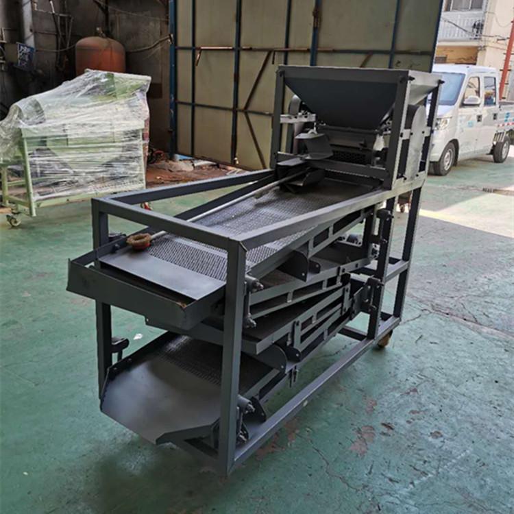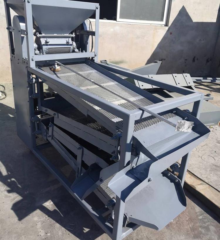 工作流程:?jiǎn)?dòng)電機(jī)后,把烘干后的花椒放進(jìn)料斗打碎,花椒經(jīng)過(guò)打碎之后脫靶、脫粒,這樣枝葉、殼、籽通過(guò)下料口落到篩面上進(jìn)行篩選,一層篩選出來(lái)的是梅花椒、大的花椒枝葉等,二層是花椒籽以及和籽大小一樣的殼,落到左側(cè)風(fēng)機(jī)口進(jìn)行風(fēng)選,每層底篩出來(lái)的是花椒的枝葉,從右側(cè)出料口落到最底層篩出,四層上篩則是成品花椒殼,整個(gè)篩選工程只需一到兩個(gè)人,非常的方便快捷。